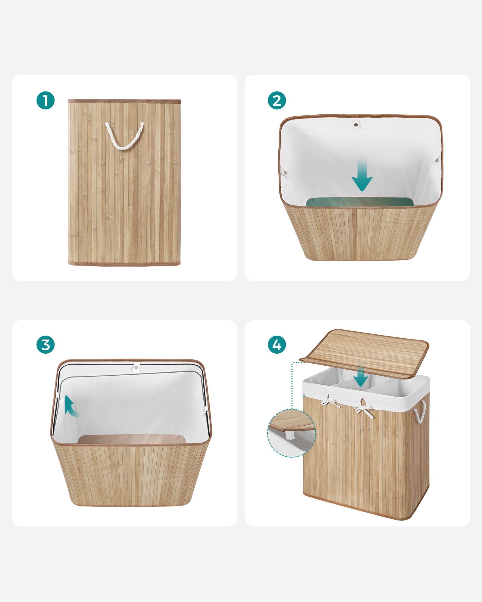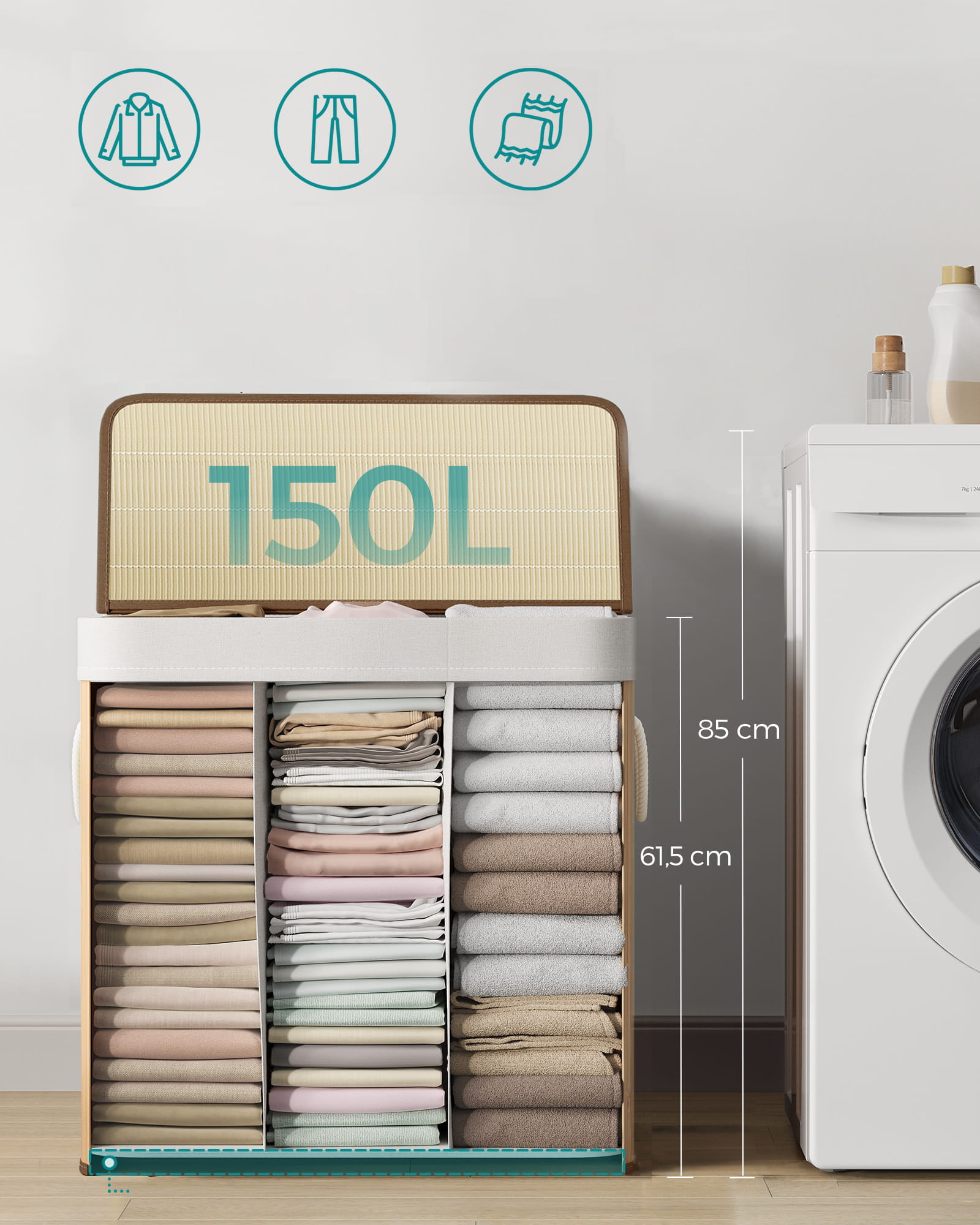 Praktyczny trzykomorowy kosz na pranie o łącznej pojemności 150 l został wykonany z bardzo dobrze prezentujących się bambusowych listewek. Odpowiedni dobór materiałów sprawia, że produkt jest odporny na ewentualne uszkodzenia.