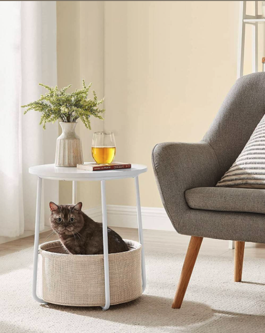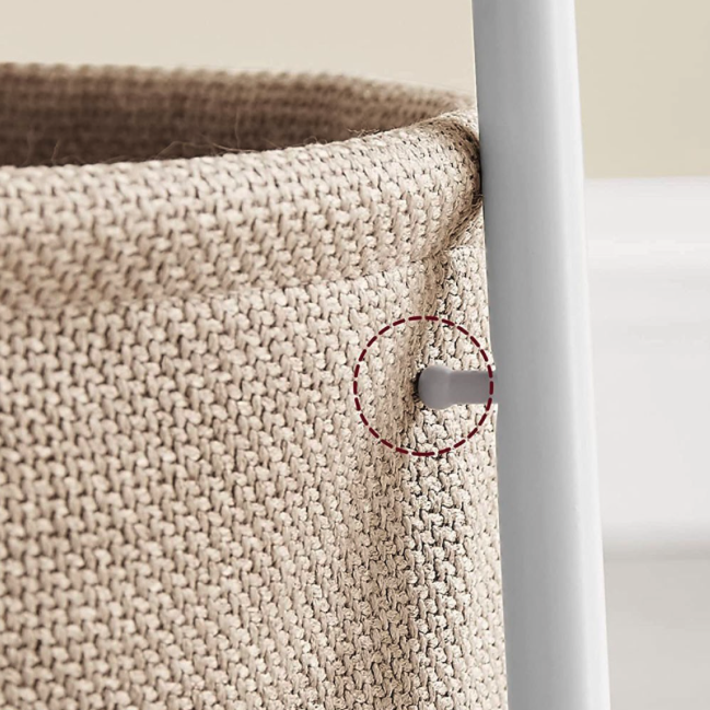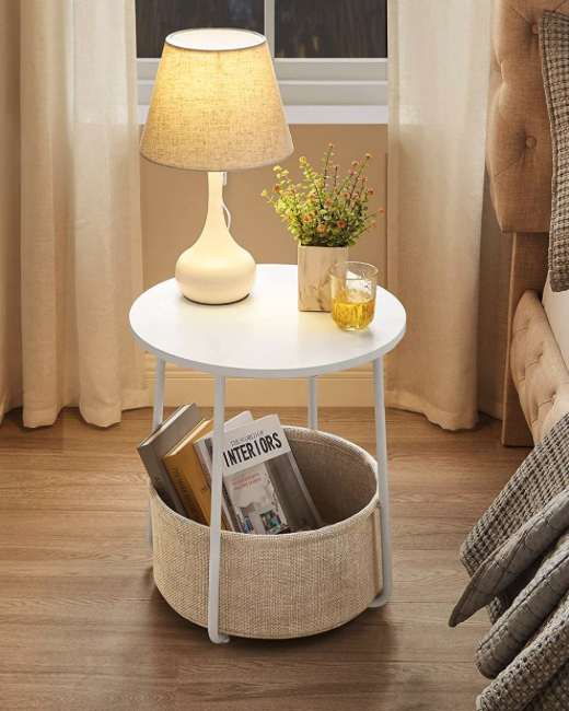 Stolik jest wyposażony w dwupoziomowy kosz wykonany z poliestrowej tkaniny imitującej len, co dodaje mu nie tylko wytrzymałości, ale i stylu. Prosty, biały, okrągły stolik kawowy z beżowym koszem wprowadzi elegancję do Twojego wnętrza.