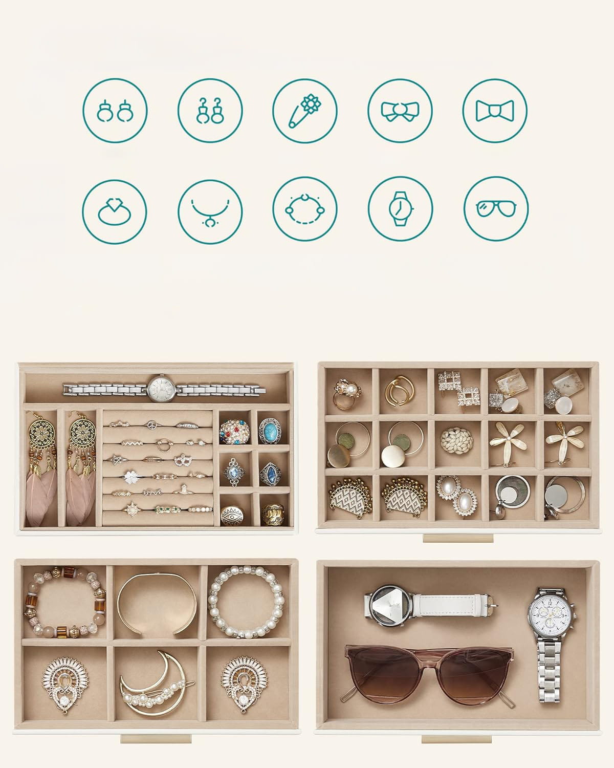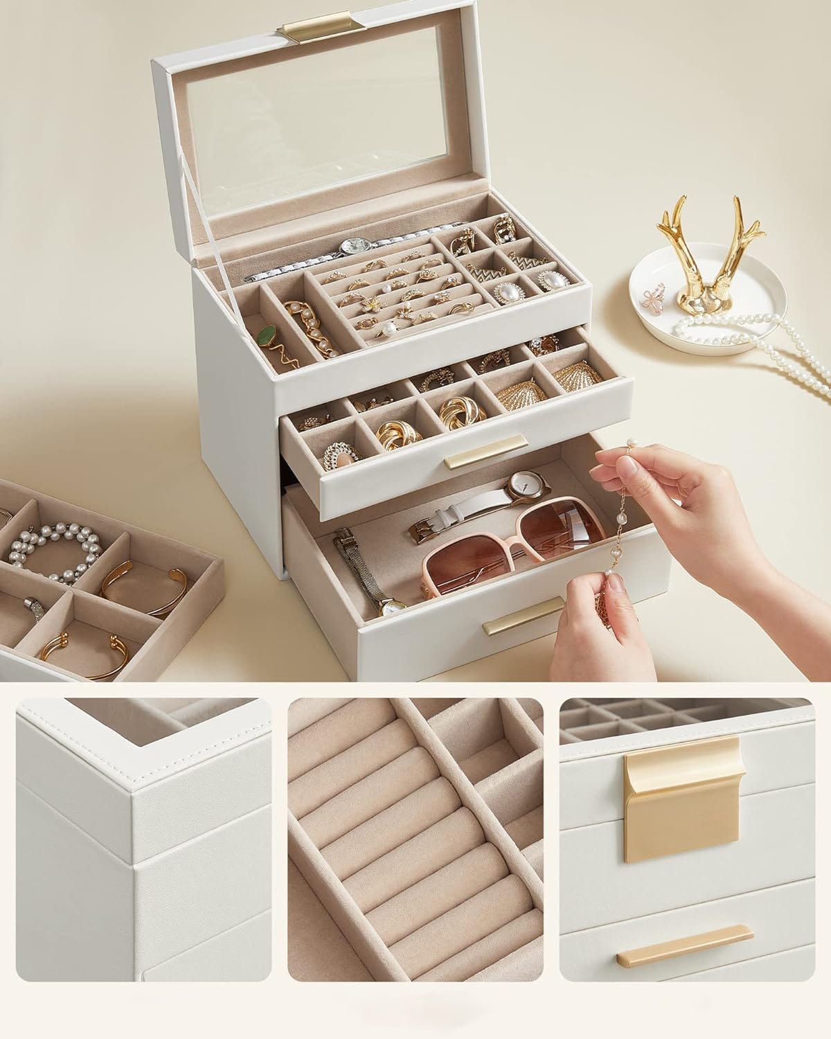 - 3 wysuwanych szuflad, które podzielone są na różnej wielkości przegródki, gdzie możemy umieścić zegarki, bransoletki oraz inne kosztowności