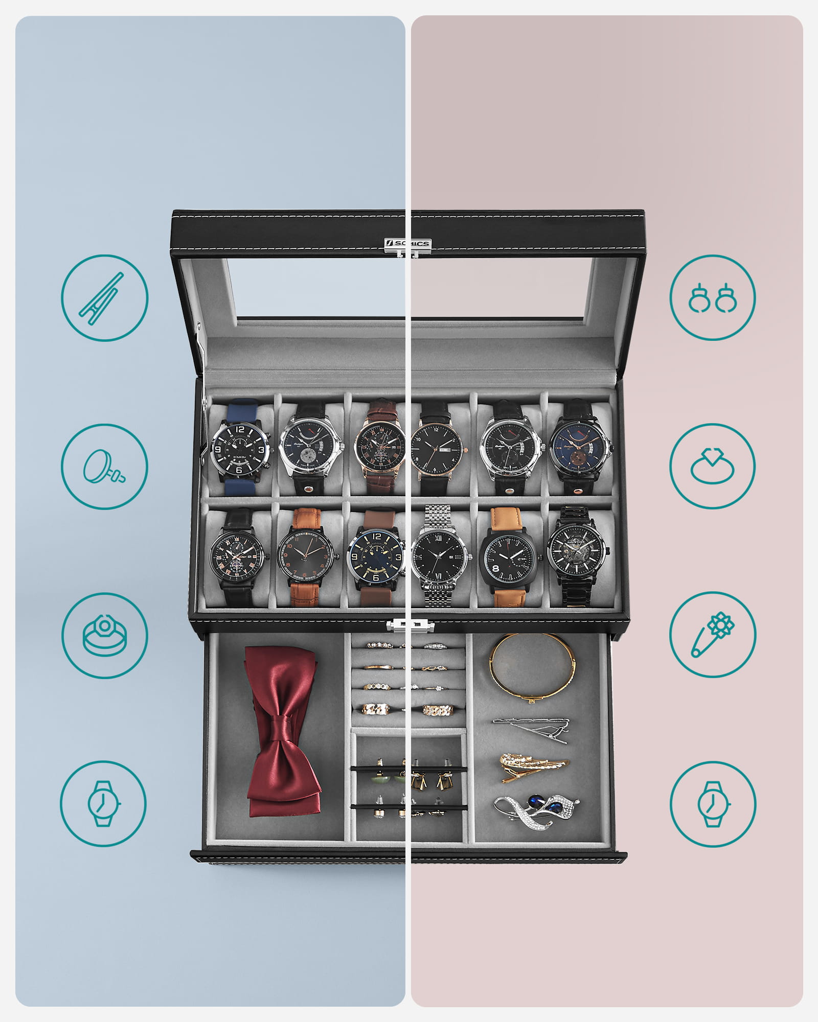 Jeżeli cenisz sobie wygodę i chcesz mieć swoją ulubioną kolekcję zegarków i biżuterii pod ręką to ten produkt jest dla Ciebie.