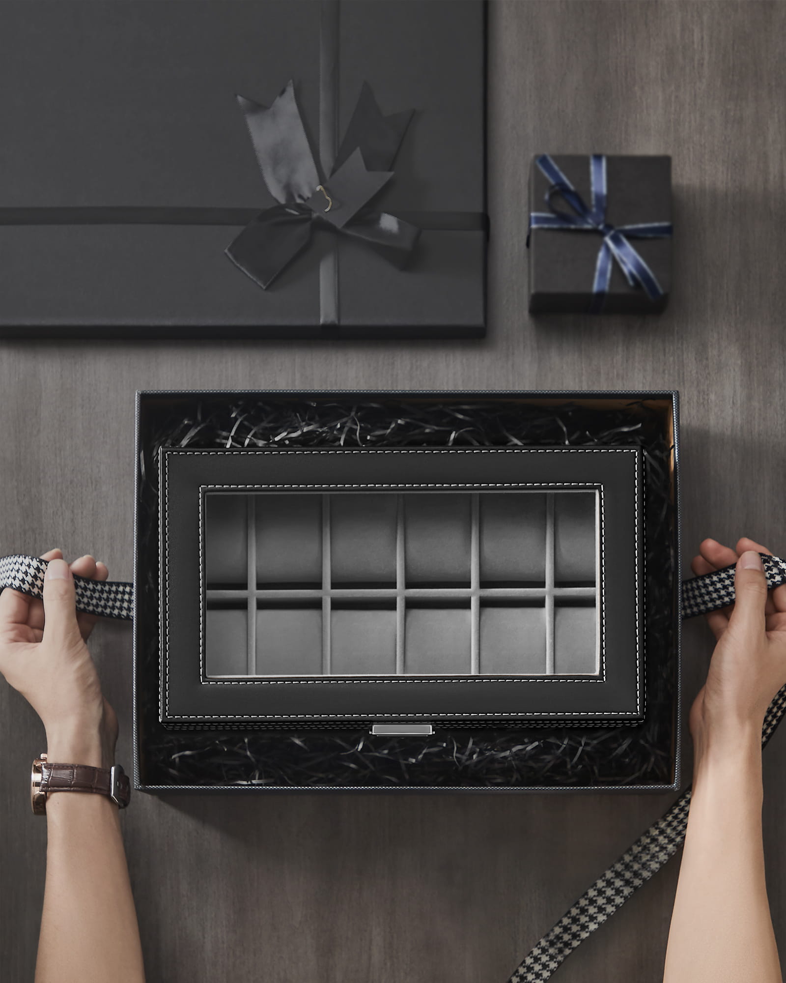 Kasetka na zegarki, biżuterię oraz inne cenne przedmioty. Bardzo elegancka i praktyczna szkatułka z elementami w kolorze szarym wpasuje się w każdy wystrój, będzie również stanowiła idealny i trafiony prezent dla każdej kobiety i każdego mężczyzny.