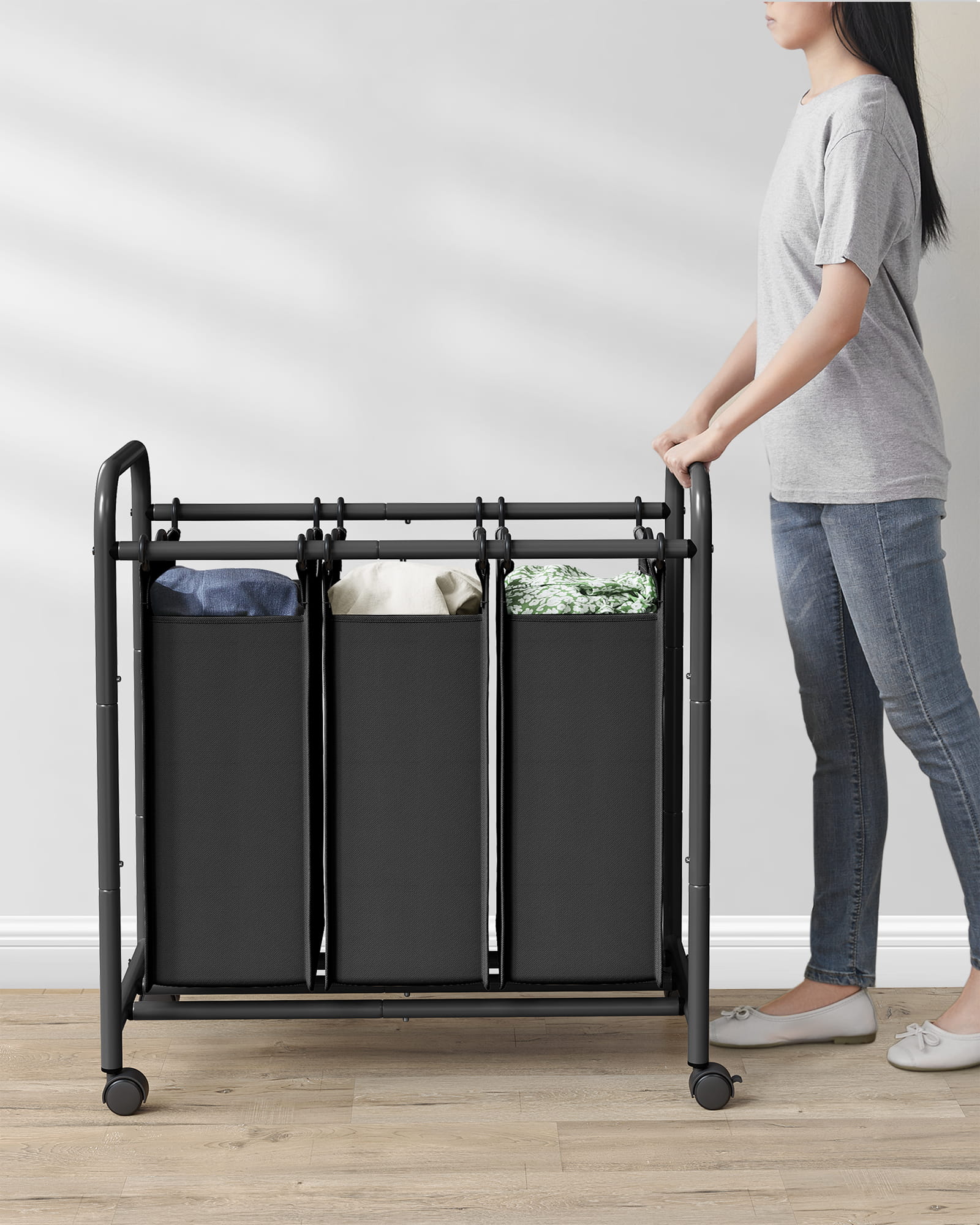 Trzy eleganckie torby z czarnego materiału można pojedynczo wyjąć, a dzięki praktycznym uchwytom są łatwe w transporcie; teraz nie musisz nosić całego kosza na bieliznę do pralki