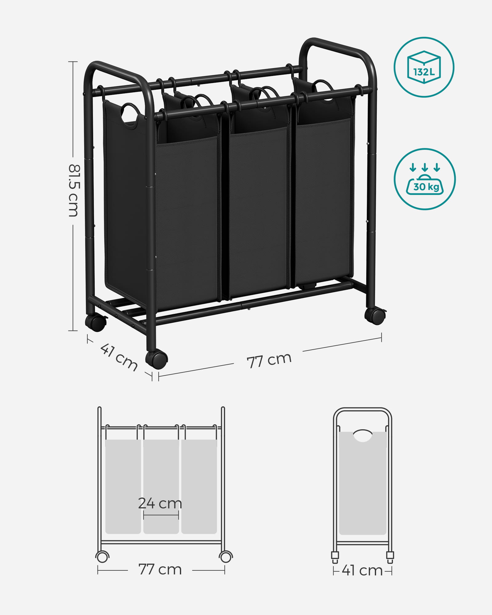 - Wymiary każdego kosza: 24 x 34 x 55 cm (szerokość x głębokość x wysokość)