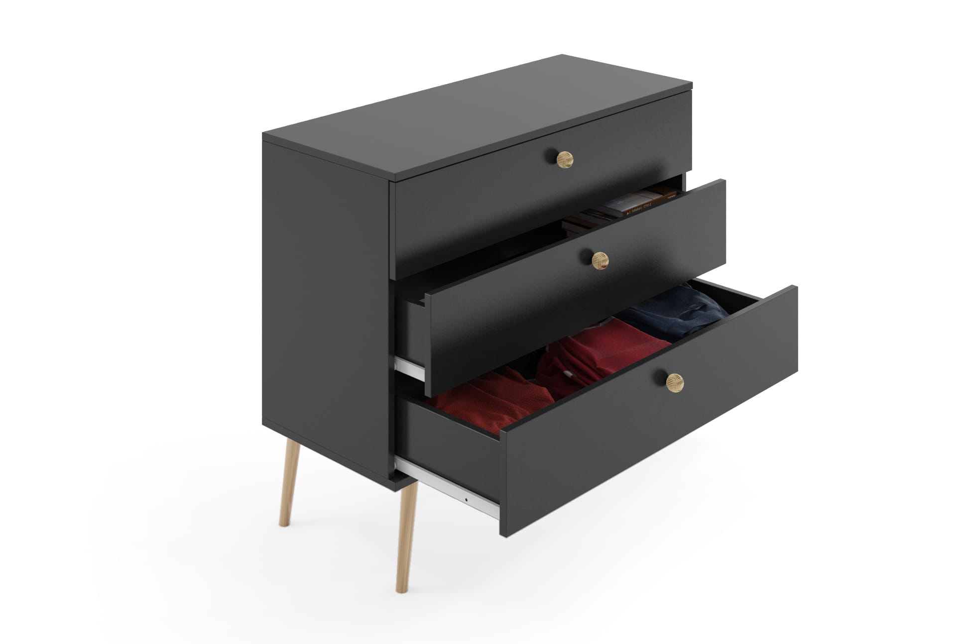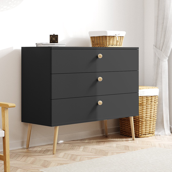 Szuflady z cichym domykiem: Wnętrze komody skrywa 3 pojemne szuflady, idealne do przechowywania rzeczy w sypialni, salonie czy przedpokoju. Szuflady posiadają prowadnice kulkowe renomowanej firmy Sevroll, zapewniające cichy domyk i pełne wysunięcie szuflady.
