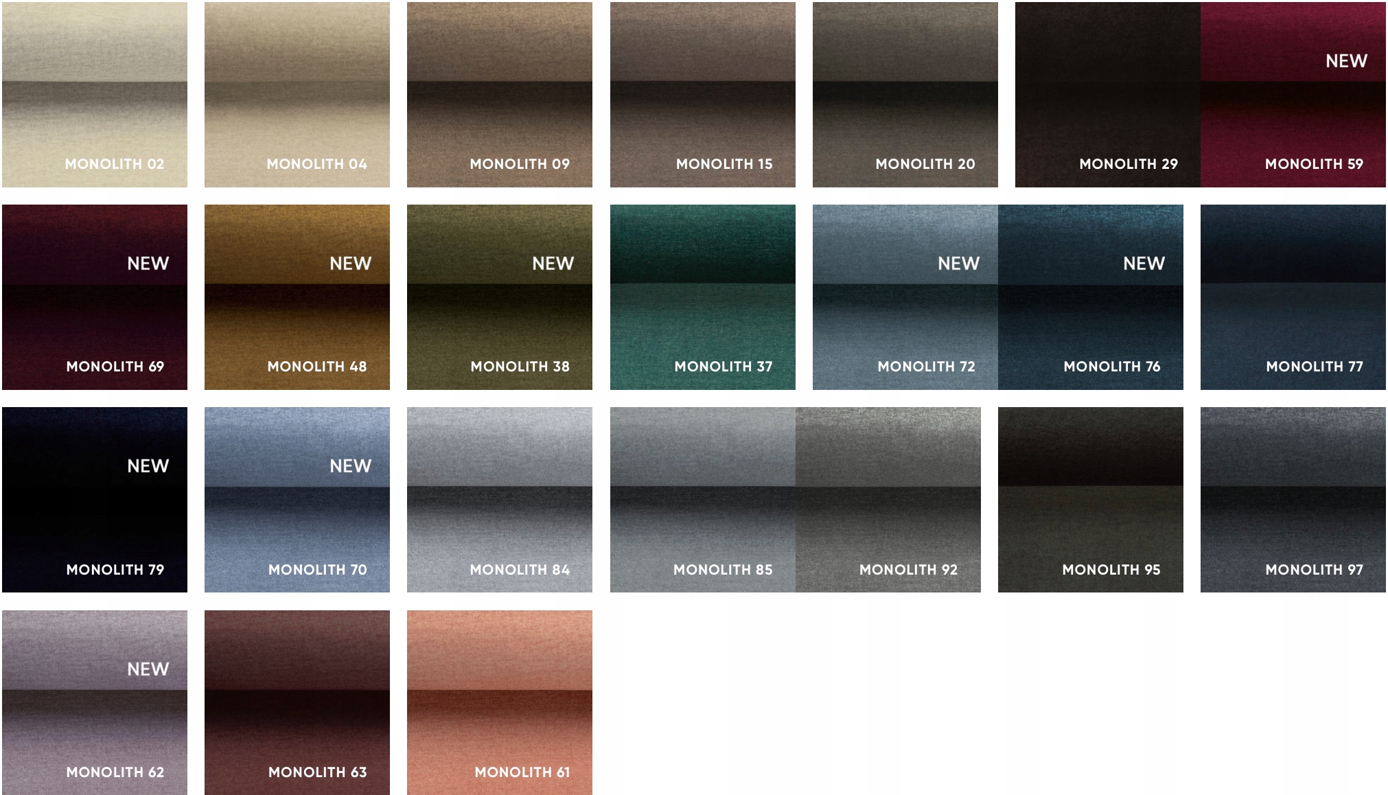 Monolith jest tkaniną typu melanż, której delikatny deseń przypomina nieco kaszmir. Takie właściwości sprawiają, że materiał nie jest całkowicie gładki i nadaje tapicerowanym meblom wyjątkowej lekkości. Tkanina ta cechuje się wysoką wytrzymałością na wycieranie, która w skali Martindale'a wynosi aż 100 000 jednostek.