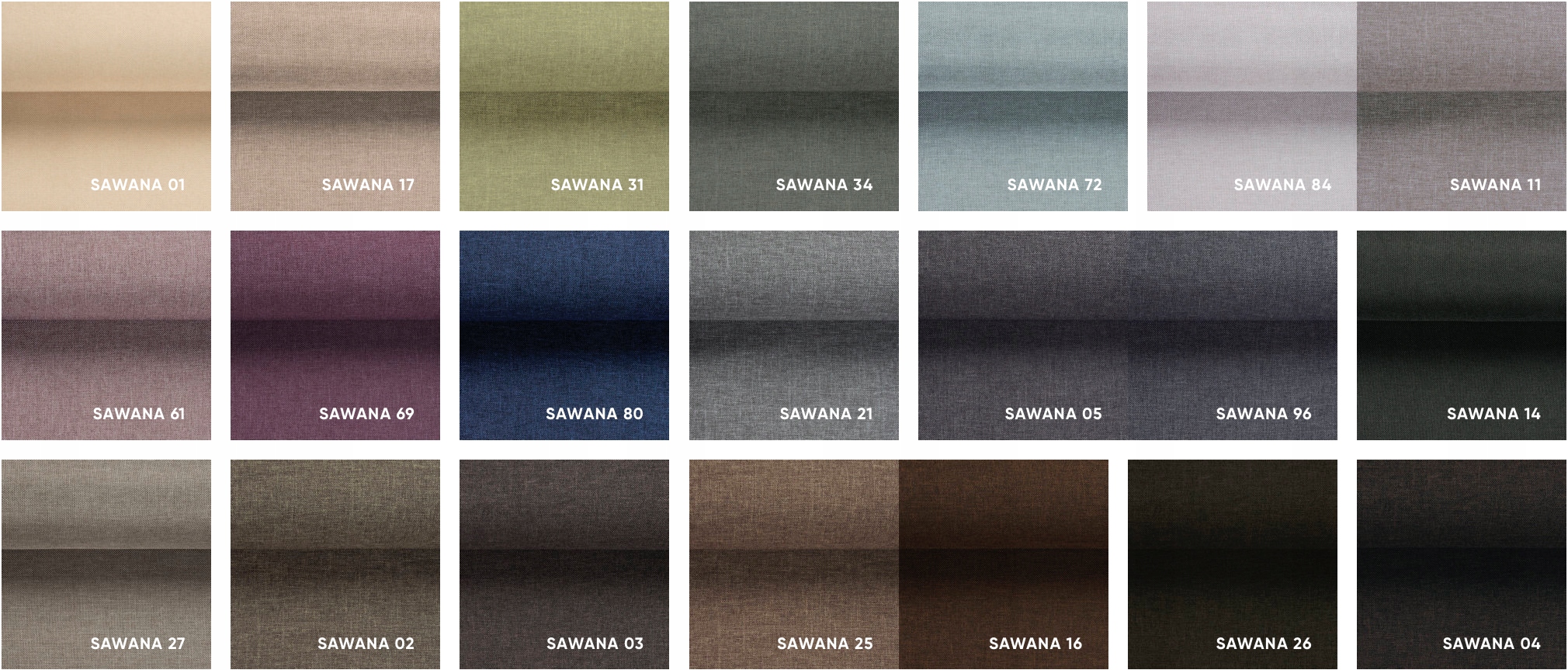 SAWANA – tkanina tapicerska o delikatnej i miłej w dotyku strukturze równej splotem płóciennej plecionki. Tkanina meblowa o dużej wytrzymałości i odporność na działanie światła. Łatwa w utrzymaniu czystości. SAWANA to doskonały materiał obiciowy na komplety wypoczynkowe, kanapy, sofy i inne tego rodzaju meble.