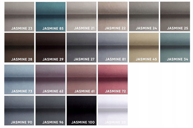 JASMINE - gładka pluszowa tkanina meblowa o jednolitych barwach, miła i przyjemna w dotyku, odporna na ścieranie. Tkanina wyprodukowana w technologii ograniczającej wchłanianie cieczy ułatwiającej czyszczenie, można prać w pralce w 30 stopniach. Tkanina tapicerska wzmocniona od spodu białą siatką doskonale prezentuje się zarówno na meblach nowoczesnych jak i klasycznych, sprawdza się na także na poduszkach - zmienia położenie nitek - "cieniowanie".