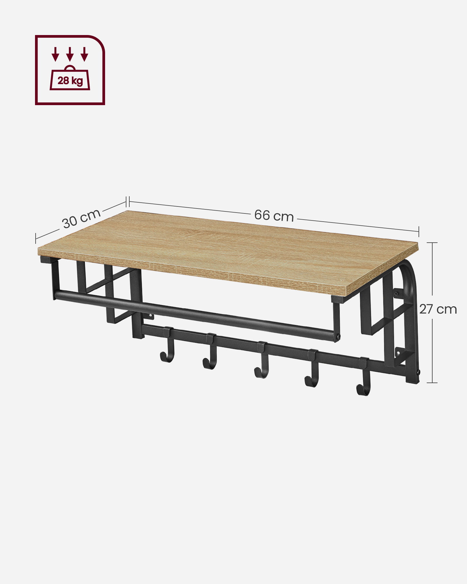 Ten niewiele zajmujący miejsca produkt posiada stabilną półkę, na której możemy umieścić kwiaty doniczkowe, parasole, plecaki, kapelusze, czapki albo po prostu umieścić nasze pięknie oprawione zdjęcia. Ponadto produkt został wyposażony w 5 haczyków do przechowywania płaszczy, kurtek, toreb czy też kluczy oraz stabilny drążek, na którym możemy wieszać kurtki i płaszcze umieszczone na wieszaku do ubrań.