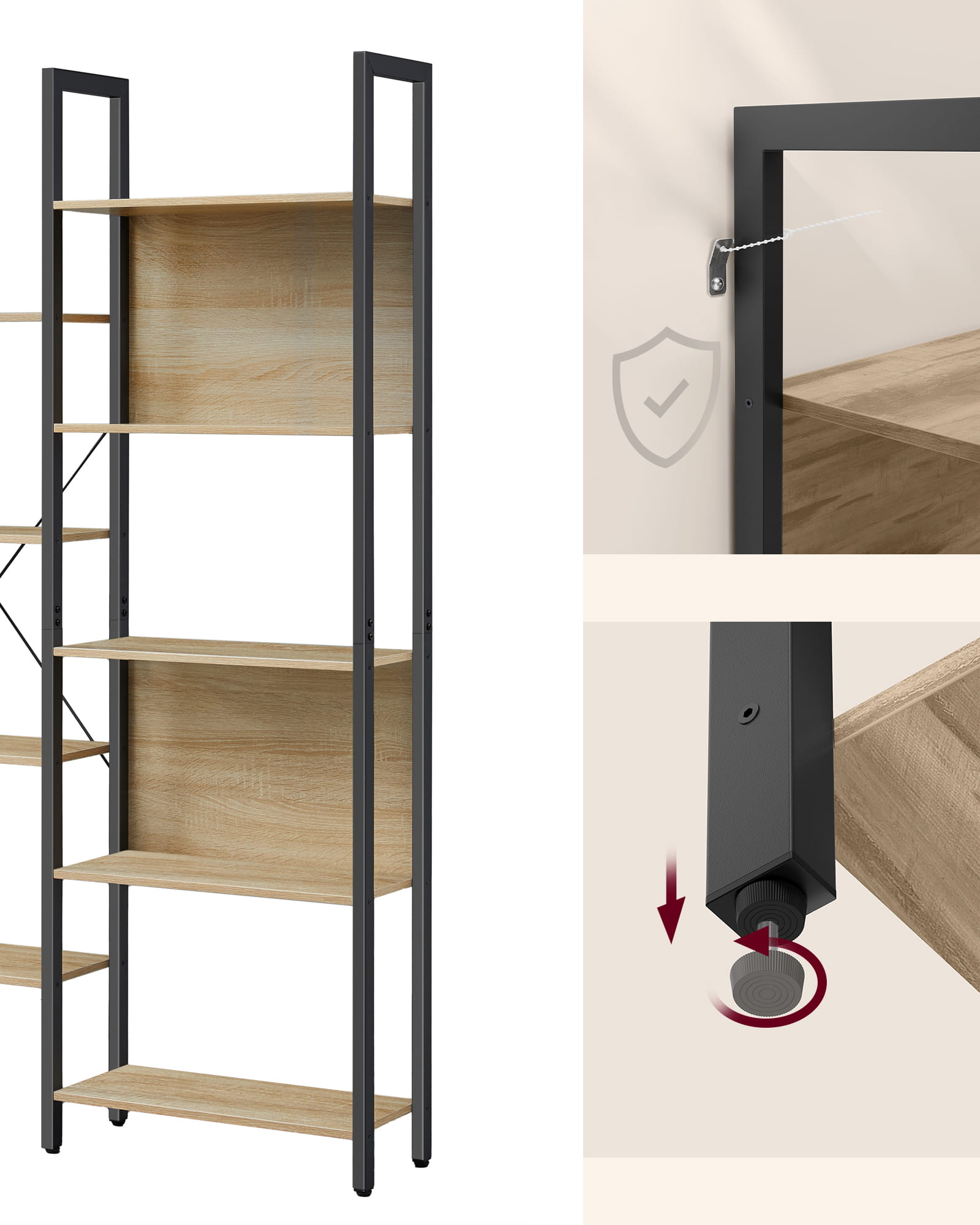 Regał wyposażony jest w 14 przestronnych półek, które pomogą Ci uporządkować książki, wyeksponować rośliny, dekoracje czy ulubione zdjęcia. Dzięki solidnej stalowej konstrukcji i precyzyjnie wykończonym elementom z płyty meblowej w kolorze dąb sonoma, regał jest stabilny i trwały, a jednocześnie nadaje wnętrzu elegancki i naturalny wygląd.