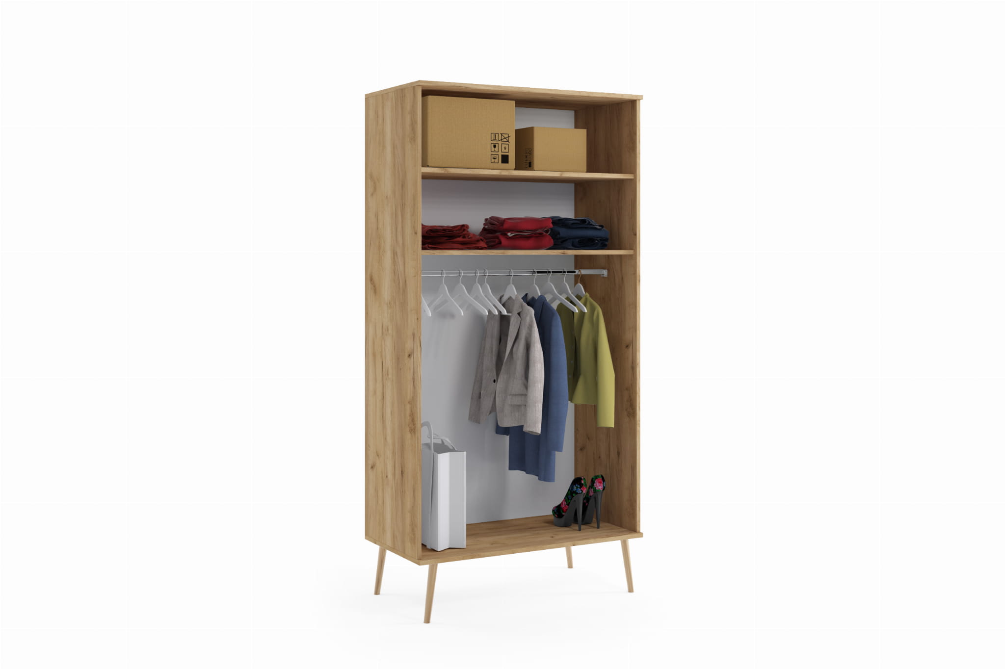 Szafa BOHO na drewnianych nogach - 2 półki i drążek - Dąb craft