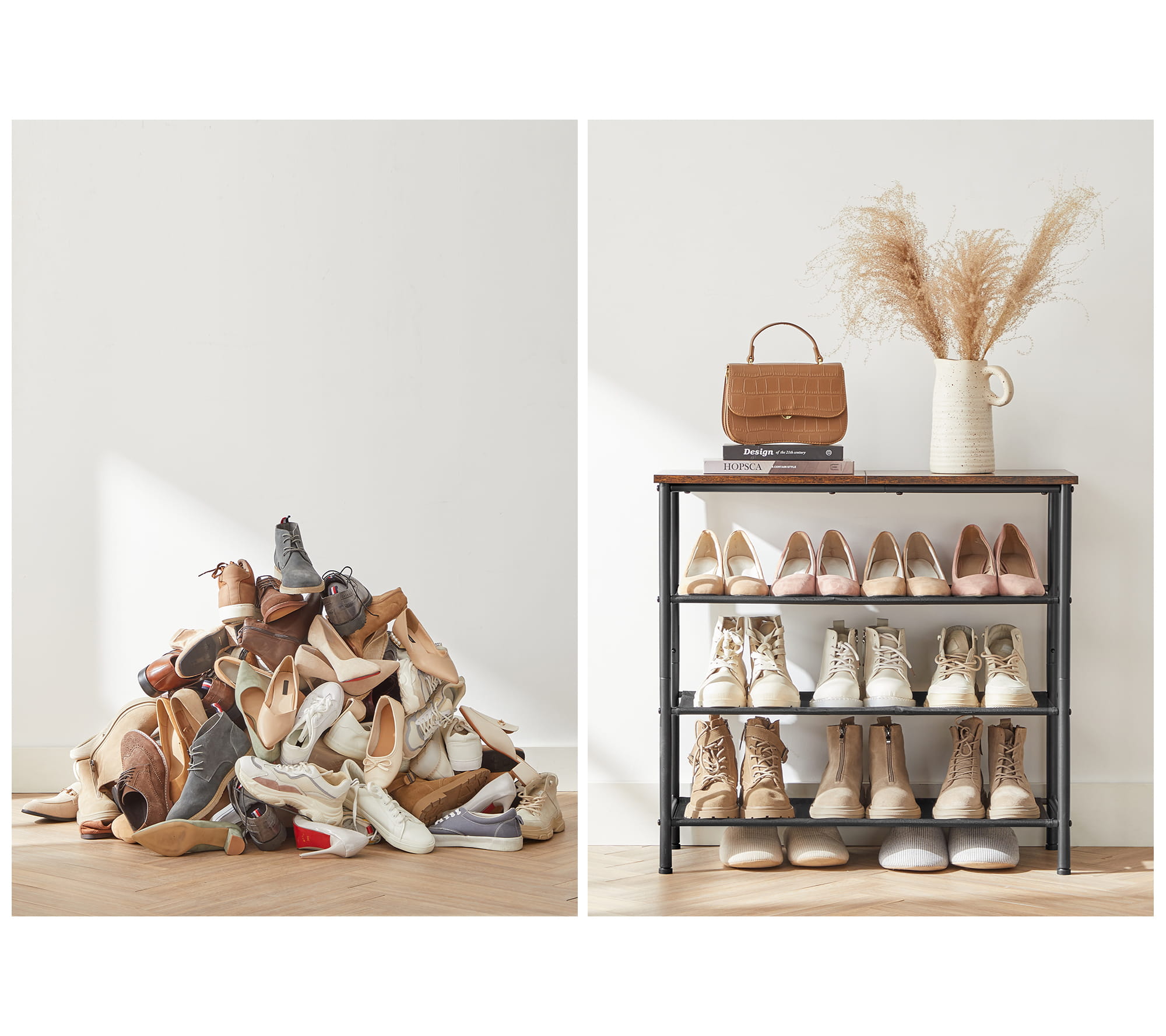Industrialny regał na buty z półką to bardzo praktyczny i elegancki mebel, który znajdzie swoje zastosowanie w przedpokoju, korytarzu, biurze, recepcji, holu czy też w sklepie.