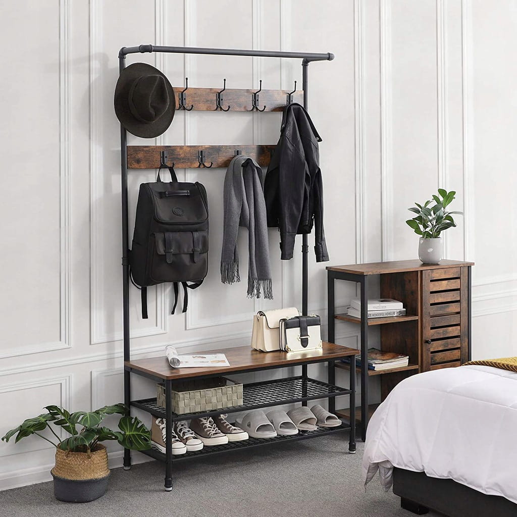 WIESZAK STOJAK NA UBRANIA Z SIEDZISKIEM I 2 PÓŁKAMI NA BUTY, RUSTYKALNY BRĄZ, W STYLU LOFT